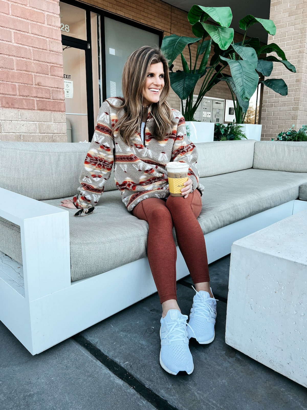 I’m also loving this Pattern Sherpa Pullover that’s on sale for under $50. The print is so fun and reminds me of winter in Colorado! It also has pockets and the warmest fleece lining that makes me feel like this would be a perfect option for any wintertime outdoor activity. With this pullover, I’m wearing another pair of Beyond Yoga (I told you, my fav!) leggings…. but THESE HAVE POCKETS! Oh and the best pair of Adidas PureBoost sneakers.