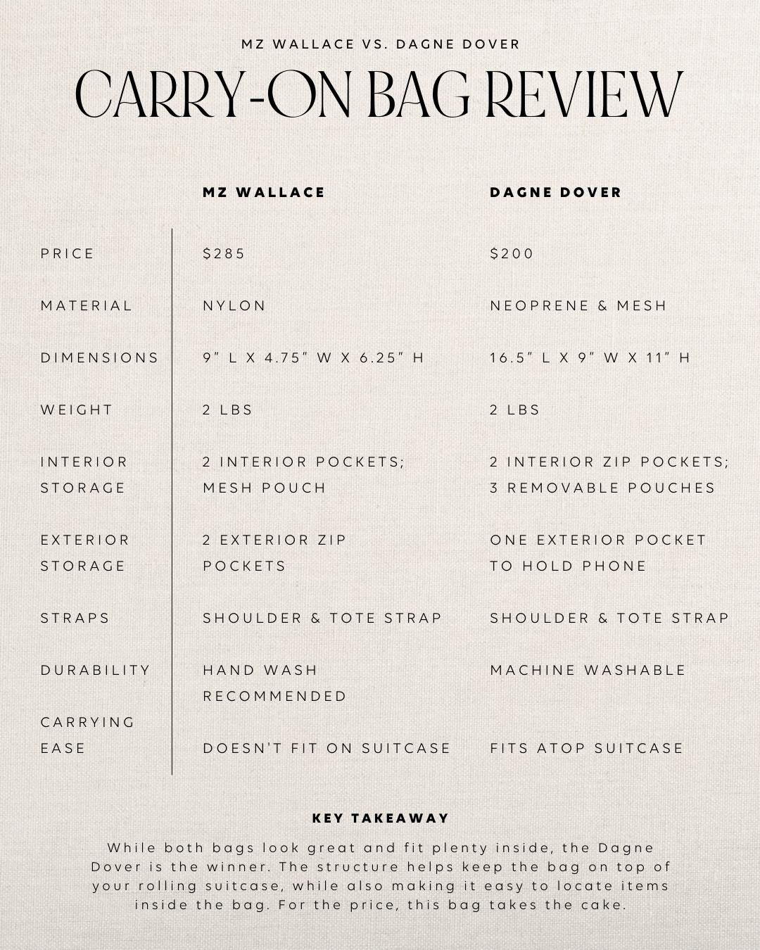 While I honestly love both bags, I would choose the Dagne Dover over the MZ Wallace. The biggest factor is that the MZ Wallace doesn’t stay on top of my suitcase. While I do like that the MZ Wallace is lightweight, I find that it’s too saggy and the lack of structure makes it hard to find stuff in my bag. At this stage of life, I am all about ease and comfort!