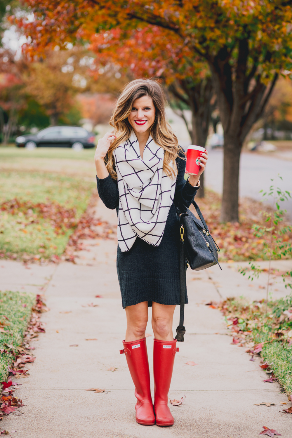 Dress: sold out but similar HERE and HERE // SCARF: oversized blanket scarf // BOOTS: Hunter Rain Boots in Red Matte // BAG: 3.1 Philip Lim Medium Pashli // LIPS: Stila Stay All Day Lip Stain in “Fiery” Red