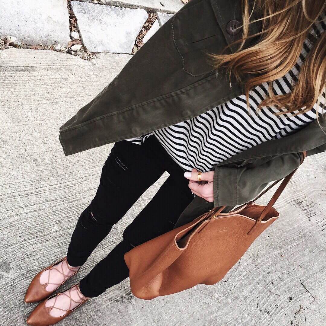 Frame ‘Le Color Rip’ Skinny Jeans // Street Level Reversible Leather Tote // BP. Cotton Canvas Anorak // Amour Vert ‘Francoise’ Nautical Top // BP. ‘Katrina’ Lace-Up Flat