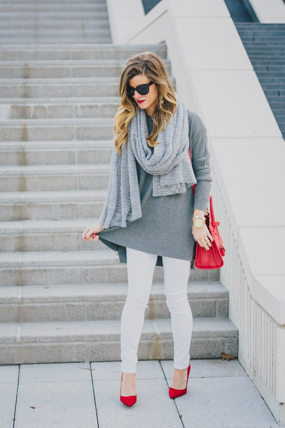 SWEATER: Grey Tunic Sweater // SCARF: Halogen Grey Scarf // DENIM: J. Brand High Rise // SHOES: Dee Keller Portia Pumps (similar opton for less here) // LIPS: Stila Stay All Day Lip Stain in Fiery Red // Bag: YSL Sac du Jour // EARRINGS: c/o Baublebar Drop Earrings // SUNGLASSES: Prada Cat Eye // CUFF: Kendra Scott Cuff // RING: Baublebar Crystal Mason Ring