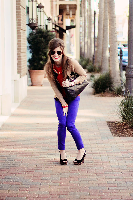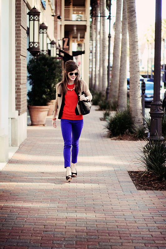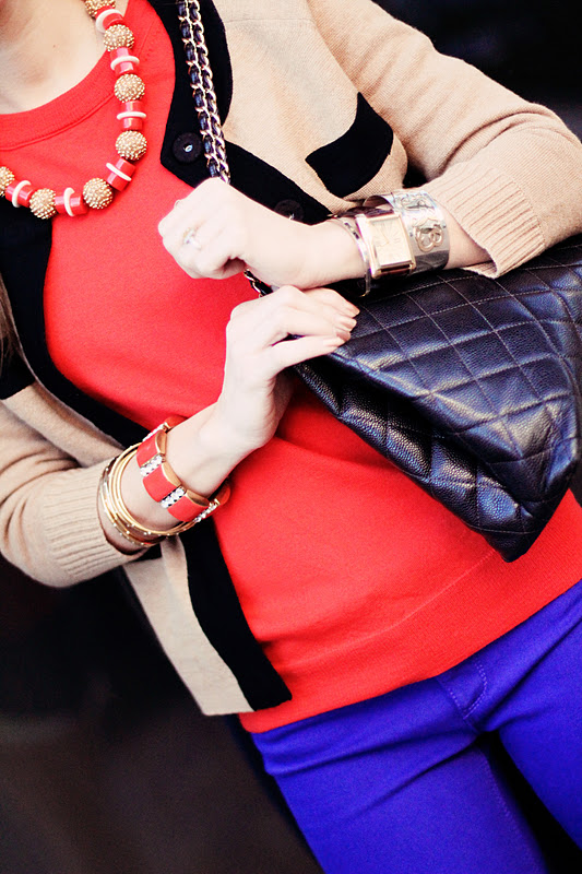 The Outfit: Orange Sweater: J. Crew Tippi Sweater in Orange | Jeans: DL 1961 Jeans in Purple | Cardigan: J. Crew Merino Cambon Cardigan (sold out) | Necklace: J. Crew Orbit Necklace | Shoes: Dee Keller (Contact me if you’re interested) | Lips: Kat Von D – Stiletto | Watch: Michael Kors – The Bradley in brown | Purse: Vintage Chanel