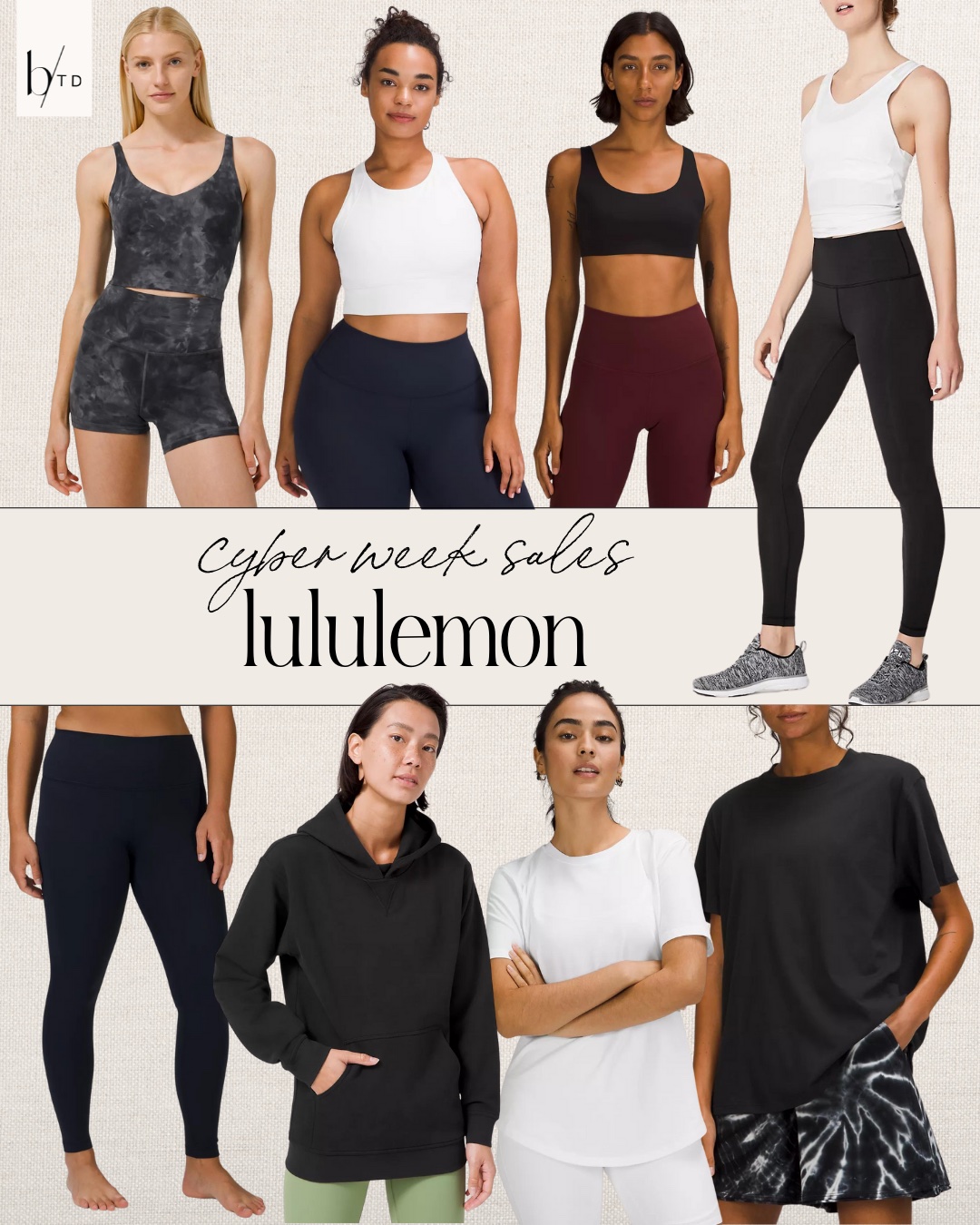 Products: Align Tank (on sale for $49), EBB to Train Bra (on sale for $39), In Alignment SS Bra (on sale for $39), Wunder Under High-Rise Tight (on sale for $69), All Yours Hoodie (on sale for for $39), Love Crew T-Shirt (on sale for $39), All Yours Tee (on sale for $39)