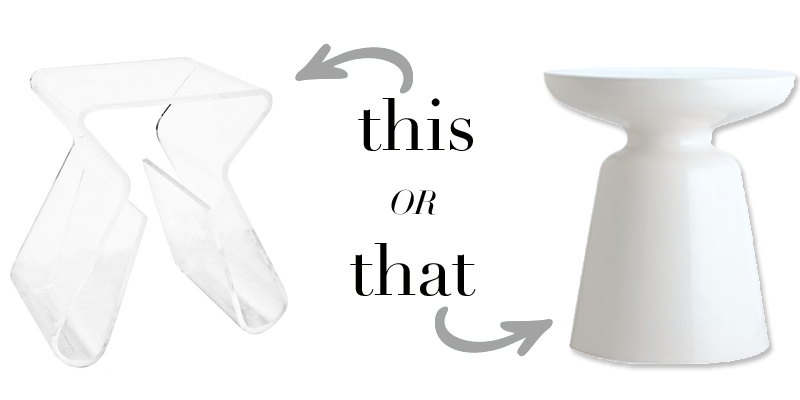 For the side tables below, I need a table to go in between 2 gold chairs that I’m eventually going to reupholster either white or hot pink . The chairs have an antique-ish feel to them, so I thought mixing in some modernness would look fun and eclectic. Thoughts? I can’t decided which one I like better!