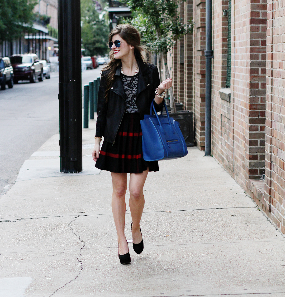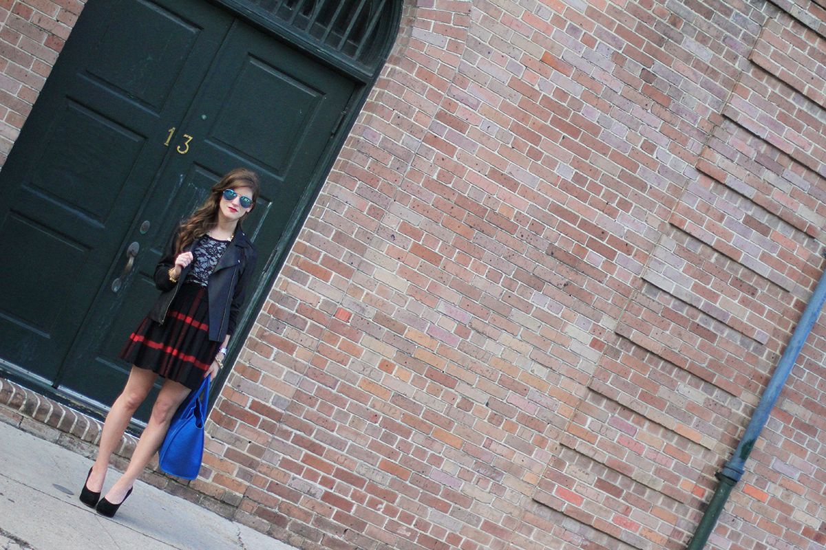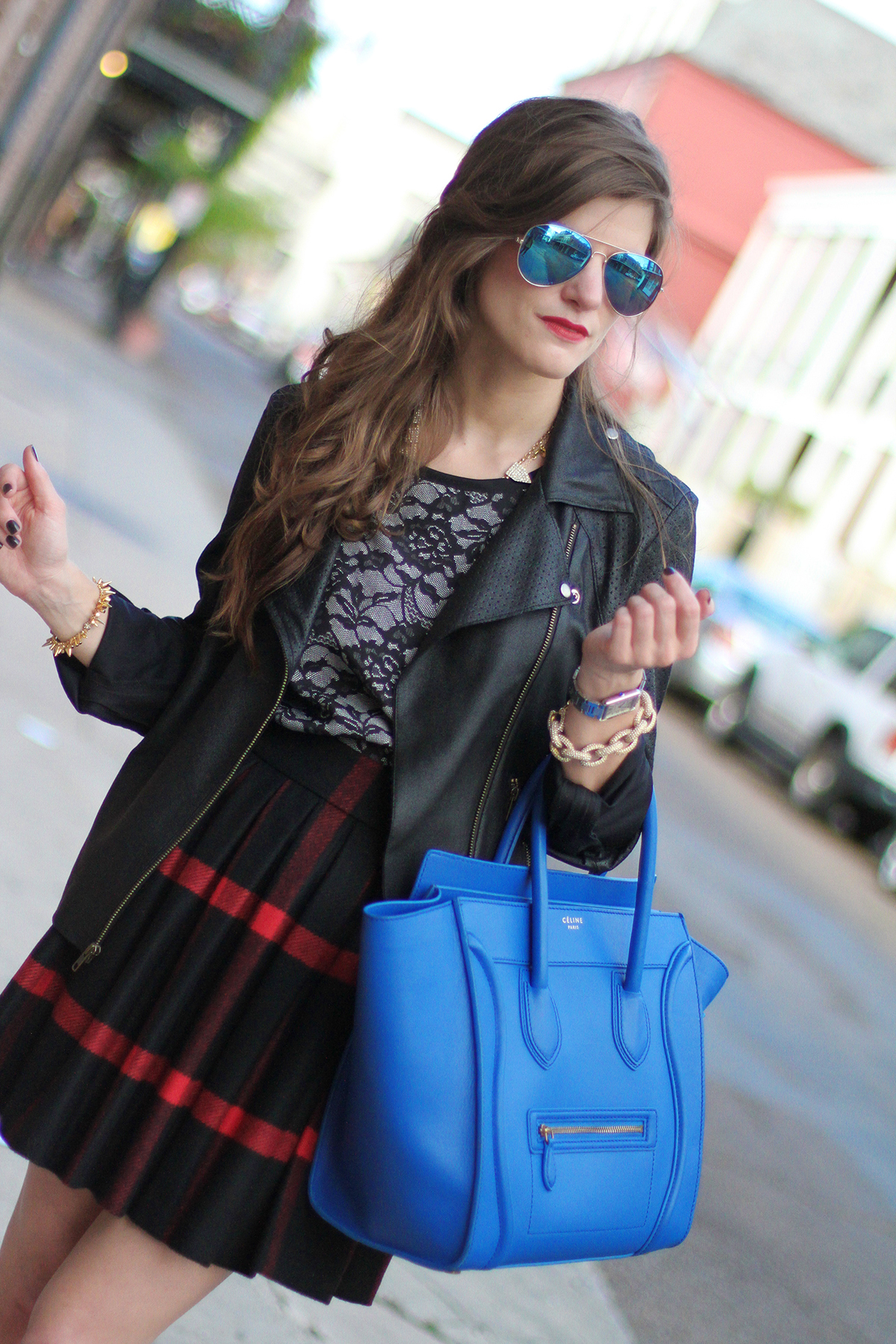 Jacket: Georgie moto jacket // Top: Robbi & Nikki // Skirt: Alice + Olivia Box Pleat Skirt in red and black plaid // Bracelets: Dotted Tusk Beaded bracelet, Pave Link Bracelet // Watch: Cartier // Sunglasses: Mirrored Blue Classic Aviators // Shoes: Dee Keller The Valerie //