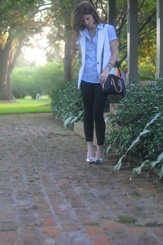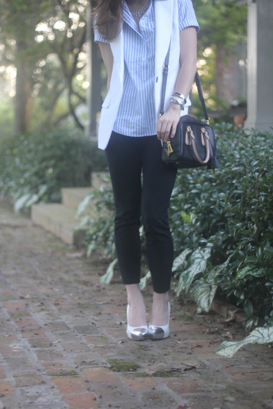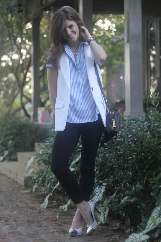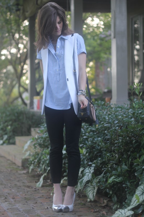 shirt: short sleeve pop over in stripe (on sale!) // vest: Sena sleeveless jacket by club Monaco (SOLD OUT) – Similar white “Tux Vest” by Madewell ($138) here // pants: jcrew minnie pant // necklace: baublebar x Honestly…wtf Ice Middleton Collar // bag: prada (old) – love this one in black in white // shoes: dee keller SS12 samples – Similar here (on sale!) by Kate Spade // watch: cartier