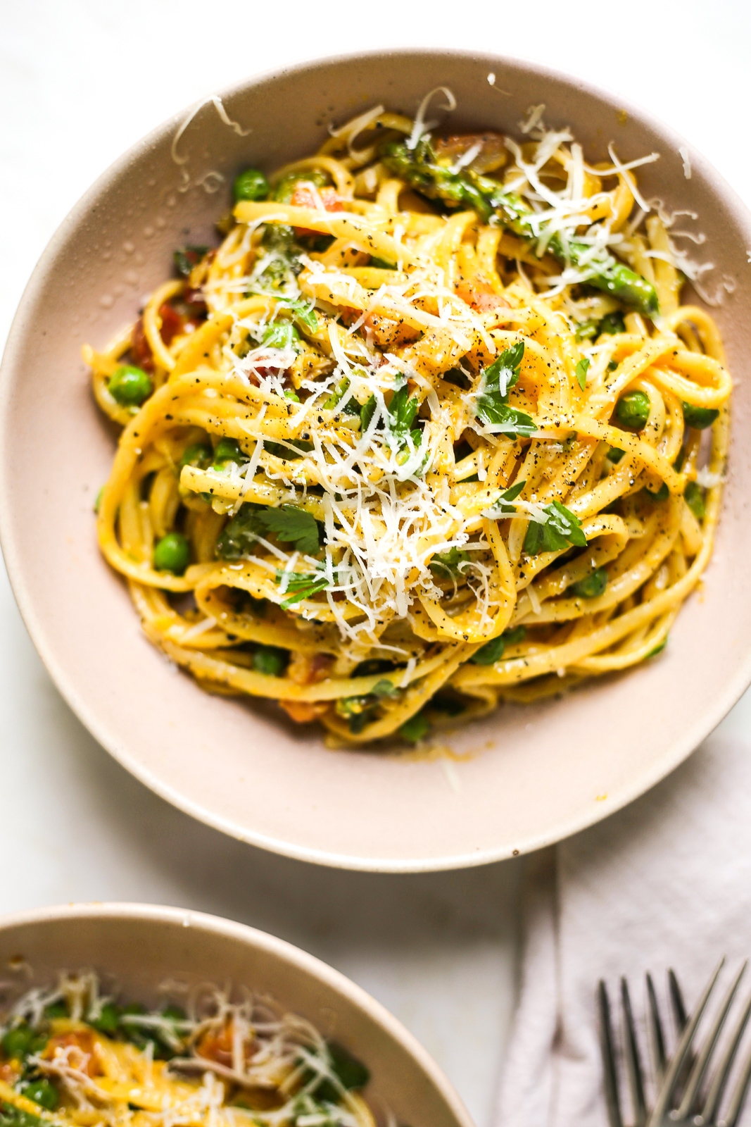 Was there any question I’d start this post off with a recipe from The Defined Dish!? I am OBSESSED with everything she shares. This spring spaghetti carbonara looks so good. I love that this pasta dish has some veggies added so you get at least a little green! Hand me a nice glass of red wine and this pasta dish and I’m all set.