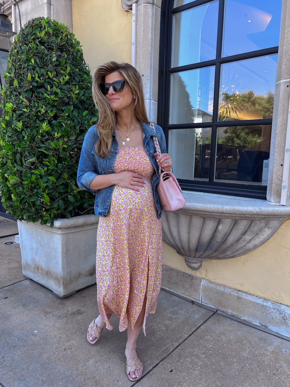 The smocking on the chest keeps this flattering, even several months pregnant, while the side seam slit makes it feel a little sexy. I’ve been styling it with this denim jacket and some slides (see my favorite summer sandals here).