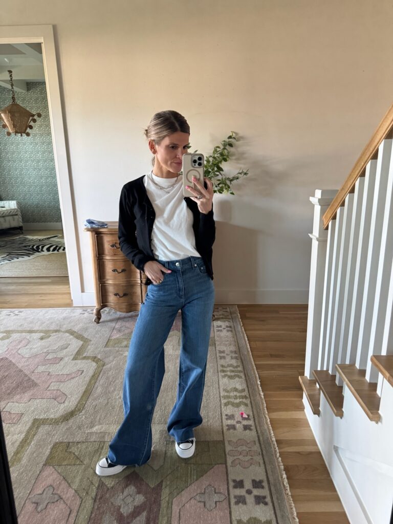 If you can’t tell, I’ve also been loving a simple outfit like the previously mentioned cardigan with jeans and a white tee. This feminine tee from Shopbop is the one I reach for most often. Paired with these wide leg jeans? Such a fun combo.
